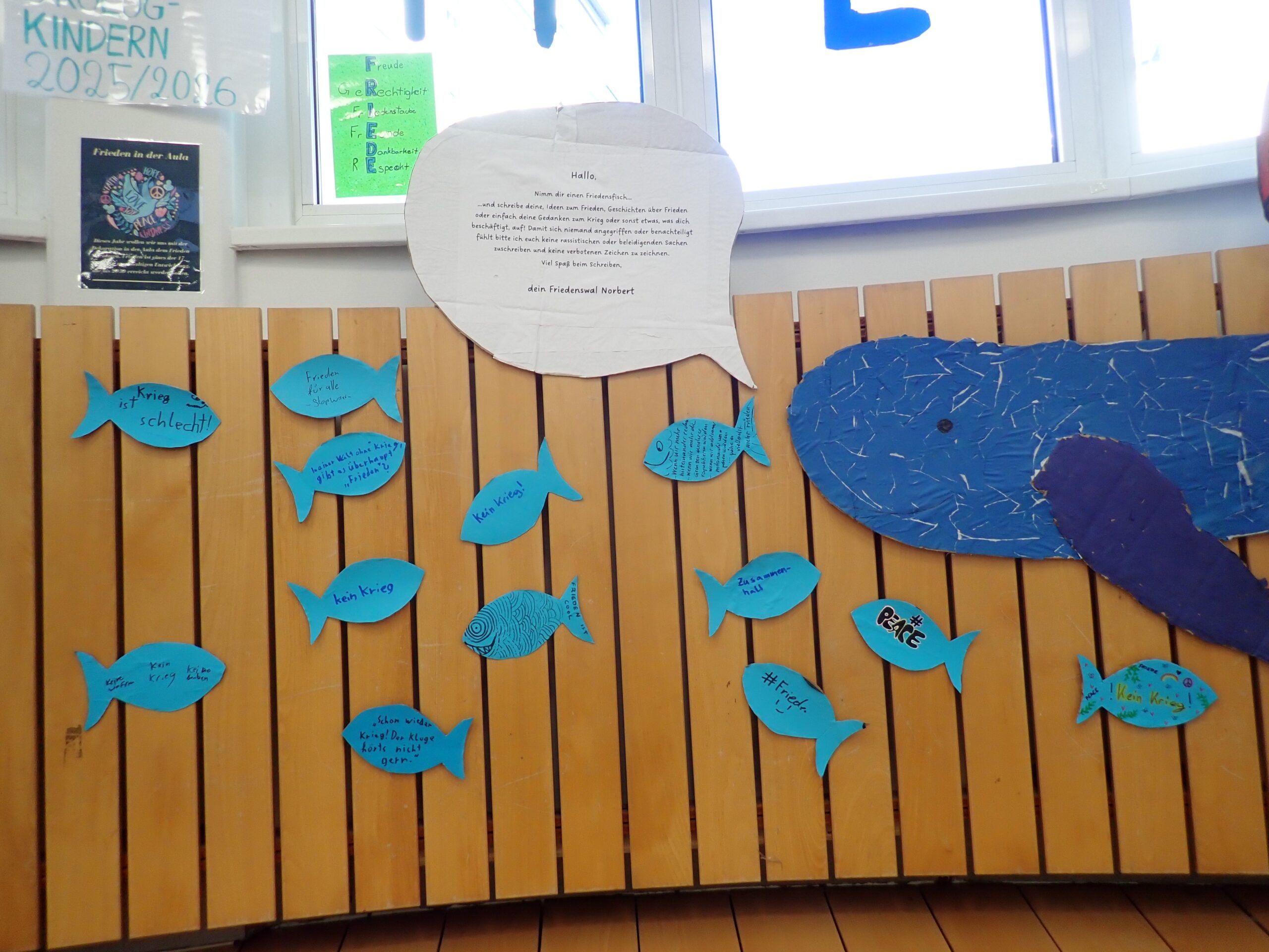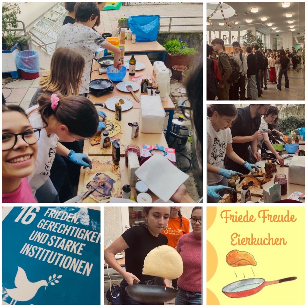 Wir nehmen diesen Spruch Ernst! Deshalb gab es zur Feier unseres Friedensprojekts am 24.03. für alle Feldmäuse Palatschinken in der Aula, höchst enthusiastisch zubereitet vom Schüler*innen ÖKOLOG-Team. Macht das die Welt zu einem besseren Ort? „Definitiv!“ bestätigt Friedenswal Norbert, der seit diesem Tag von einem Schwarm munterer Friedensfische begleitet wird, „Wir werden damit die globalen Konflikte nicht lösen, aber je mehr wir das Miteinander leben, desto weniger Platz gibt es für das Gegeneinander, auch hier an der Feldgasse!“